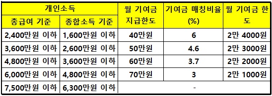 * 본인 납입액이 각 소득의 지원금 지급한도(40만~70만원) 보다 적으면 본인 납입액에, 지원금 지급한도보다 크면 지급한도액에 각 소득별 매칭비율(3~6%)을 곱해 지원금 한도산출.